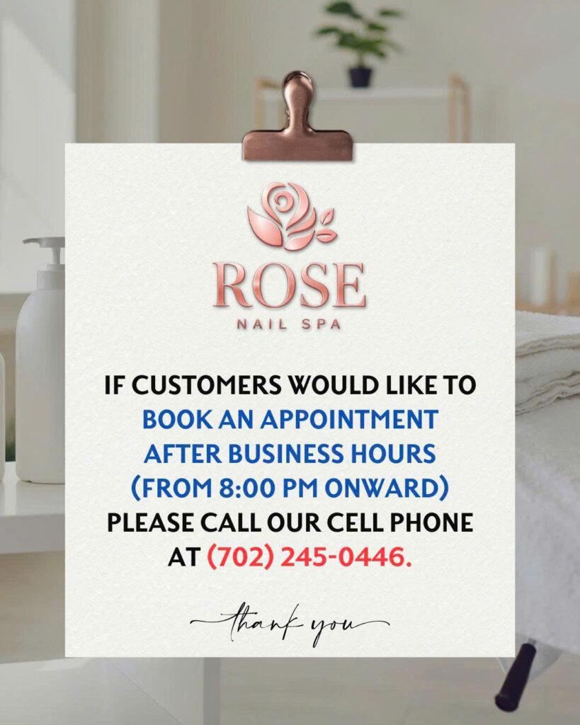 At Rose Nails & Spa, we believe self-care is essential. Whether you want a simple, elegant look or trendy nail designs, our team is dedicated to delivering beautiful results and excellent customer service.